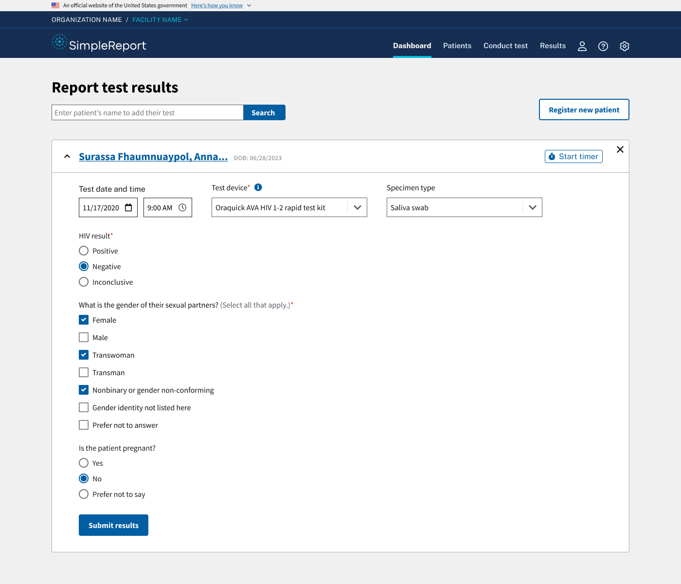 We created more detailed interactions to support HIV testing workflows, building out an interactive, high-fidelity prototype. We then conducted several rounds of usability testing, including 18 remote and in-person sessions with community-based organizations in LA County and users across the U.S. These helped us identify usability issues in the design, along with other features and considerations for successful product adoption. For instance, we learned that we needed additional options to accommodate testing participants who were unhoused or did not wish to share demographic information, so we made changes to our patient registration form to allow users to submit facility information or other notes in lieu of patient address and phone number. We also worked closely with our stakeholders to streamline data requirements, particularly for negative tests.