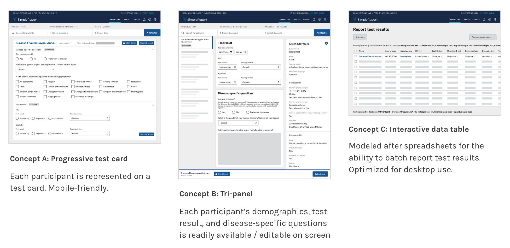 We began our design phase by exploring three divergent concepts to support users’ workflows in a variety of testing environments, and created mid-fidelity Figrma wireframes for each that demonstrated concepts and key functionality. We used these to conduct remote concept tests with 7 HIV testing staff from organizations in LA County and throughout the U.S. The feedback we received helped us identify aspects of each concept that best supported our users’ workflows, and we honed in on features such as progressive disclosure and a mobile-friendly test card design.