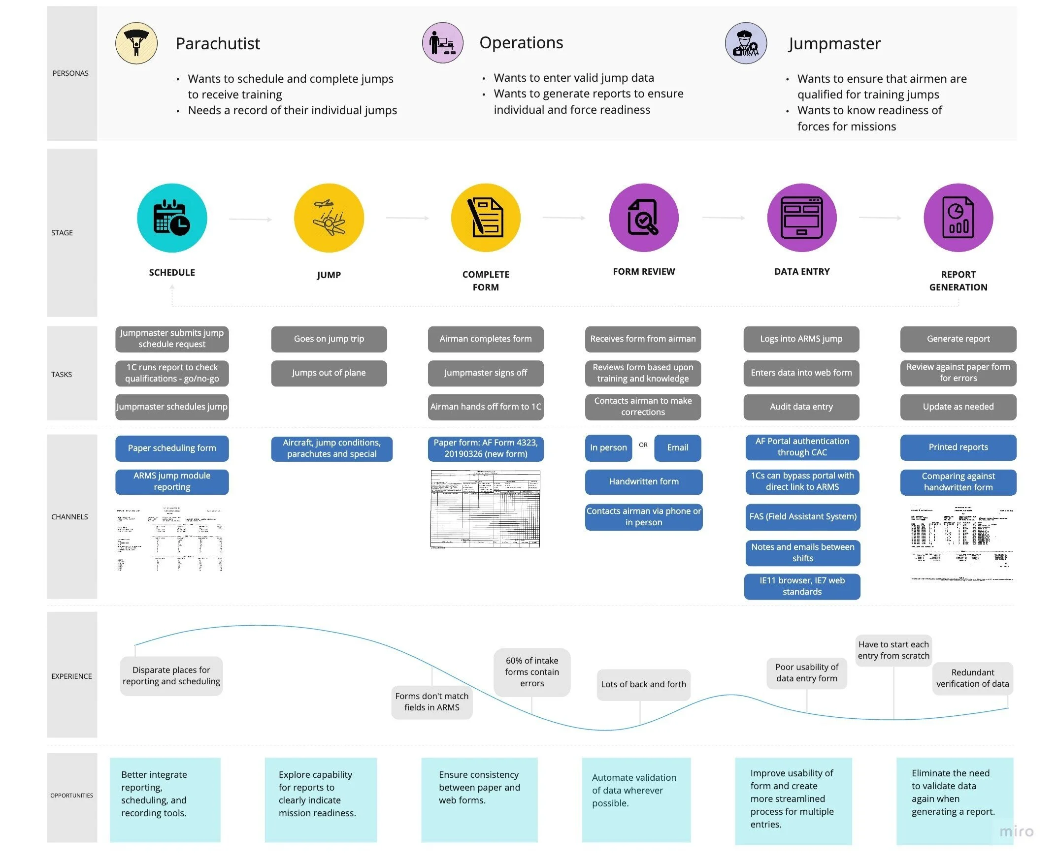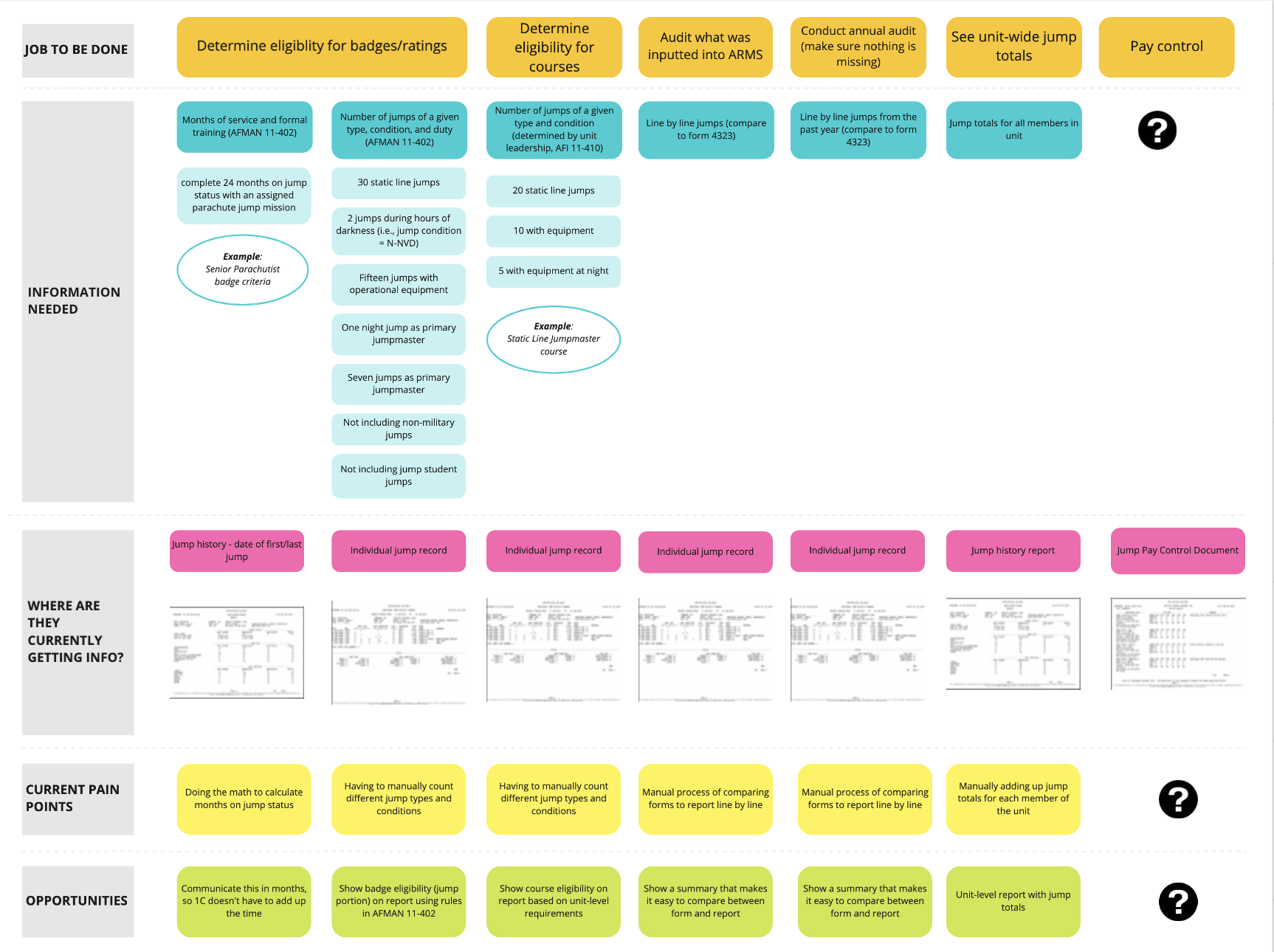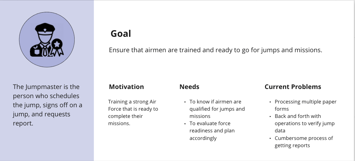 ARMS is a mission-critical application that the USAF uses to track and manage flight data for about 65,000 aircrew and parachutists — including flying hours, flight and jump schedules, readiness information, and training and evaluation. It consists of seven different functional modules, such as Jumps (jump training records management) and Training (student profile management and accomplishments). About 2,800 aviation resource managers rely on ARMS to perform over two million transactions per week. These users experience multiple pain points because the original system was not built around the reporting and information gathering needs of its users. Our team sought to uncover the core “jobs to be done” by this system to create a more user-centered and efficient tool.