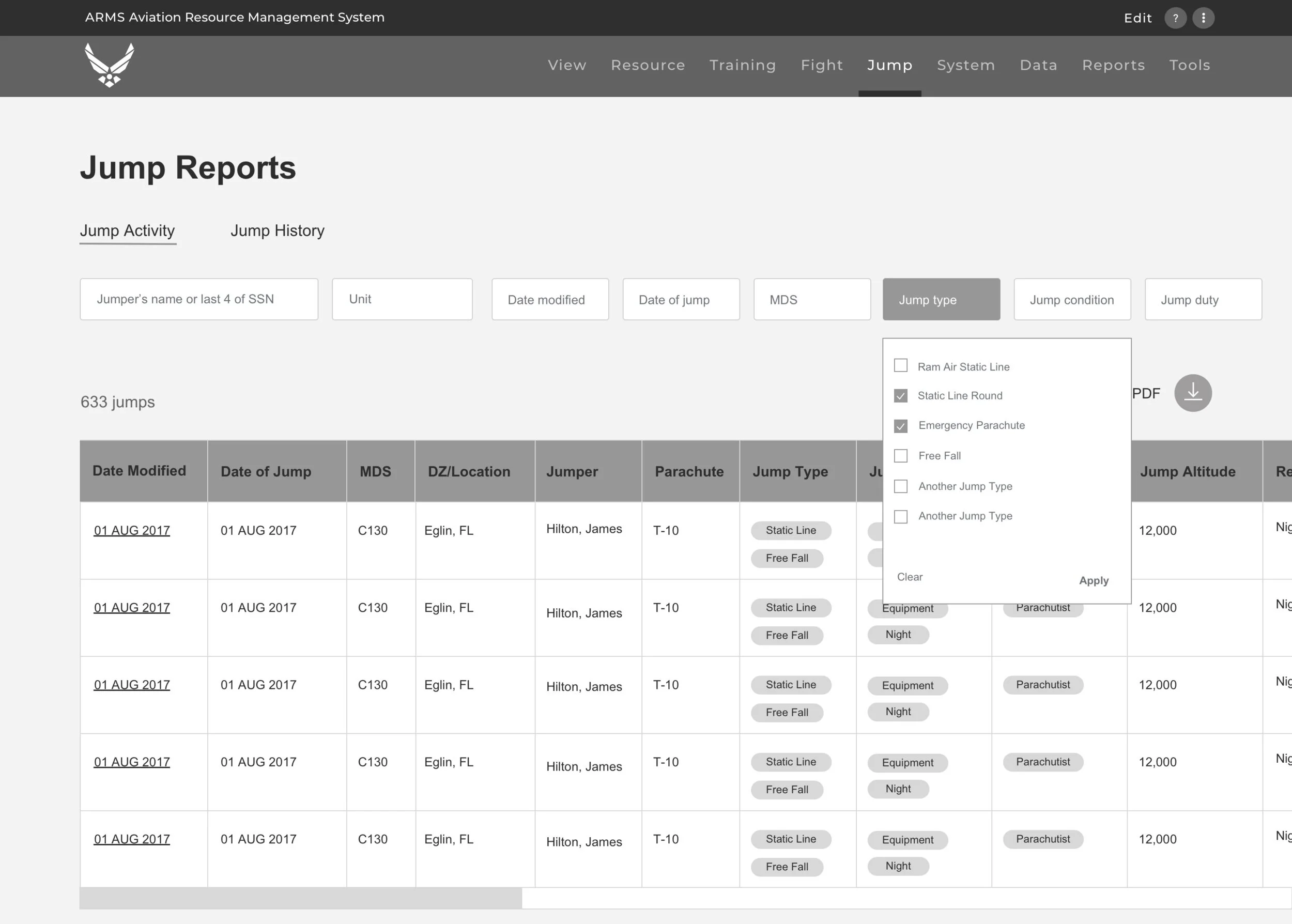 Users can generate a custom report by filtering, allowing them to more easily discern unit-wide jump totals of a certain type.