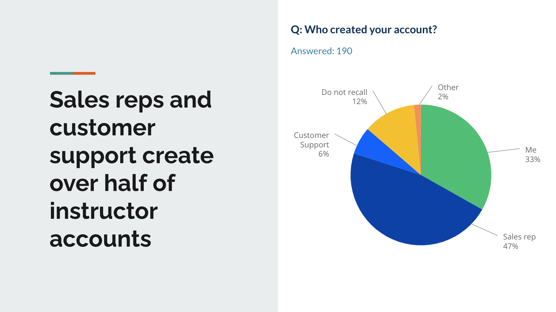 Having discovered these pain points, I sought to uncover the prevalence of these issues so I launched a survey to 200 instructors who had recently adopted digital courseware. The survey findings, which indicated just how common it was for sales reps to demo products in this way, highlighted a huge pain point in our adoption and onboarding experience and made it clear where to focus product efforts.